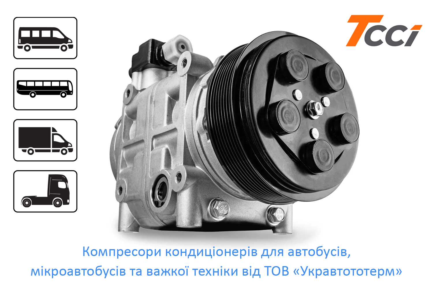 ТОВ «УКРАВТОТЕРМ» радо повідомляє про нові надходження потужних компресорів для важких умов експлуатації від бренду TCCI серій QP21 і QP31, що застосовуються в системах кондиціювання та вентиляції повітря (HVAC) автобусів Iveco, Man, Scania, Mercedes, Renault, Volvo, Solaris, Neoplan, Solbus, Isuzu, EvoBus, військових спеціальних транспортних засобів, сільськогосподарської і будівельної техніки, а також в транспортному холодильному обладнанні (рефрижераторах).